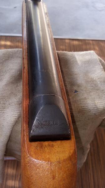 Os paso algunas fotos de la carabina y amplio detalles por si a alguien le interesa para identificarla. Lleva lo que parece ser un número de serie 07009. En el tapón de cámara lleva la marca NORICA, así como en la culata. Sobre la cámara pone Mod.60. El punto de mira es plano con un reborde que recorre la parte superior. El gatillo es de chapa.