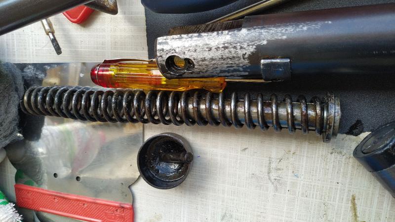 Lo del muelle ha sido una pesadilla: le corté 3 vueltas pero no había (al menos sin las herramientas apropiadas) quien lo pusiera en su sitio. Finalmente, le corté otra vuelta más y con la ayuda de un tornillo de banco, un sargento de carpintero, mucho esfuerzo y un puñado de pellizcos en las manos, conseguí enroscar el tapón. Piezas nuevas, lleva solo el muelle y el sello del pistón. La tórica del cañón que compré no es válida: tiene el mismo tamaño que la original pero es más fina, por lo que viene holgada y se cae. Le he vuelto a poner la original, muy gastada y no cierra bien, pero de momento me apaño con ella hasta conseguir la adecuada.