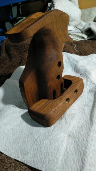 Quita un poco de material en la zona donde apoya el pulgar y observa si puedes meter mejor la mano y esta gira al rededor de la empuñadura, si gira un poco más " que girará" pones relleno donde te falte.