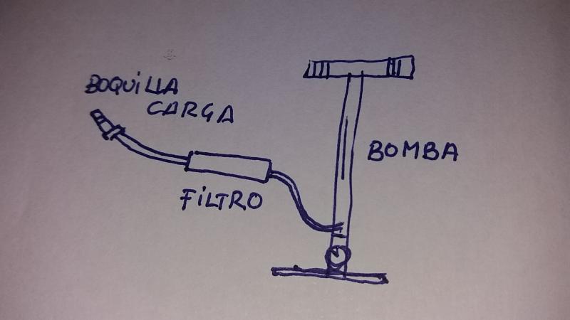 Dejo un croquis de la idea, no se si alguno lo ha hecho, la bomba es una GAMO PCP como he dicho. La cuestion es donde comprar el propio filtro, latiguillo y conexiones.