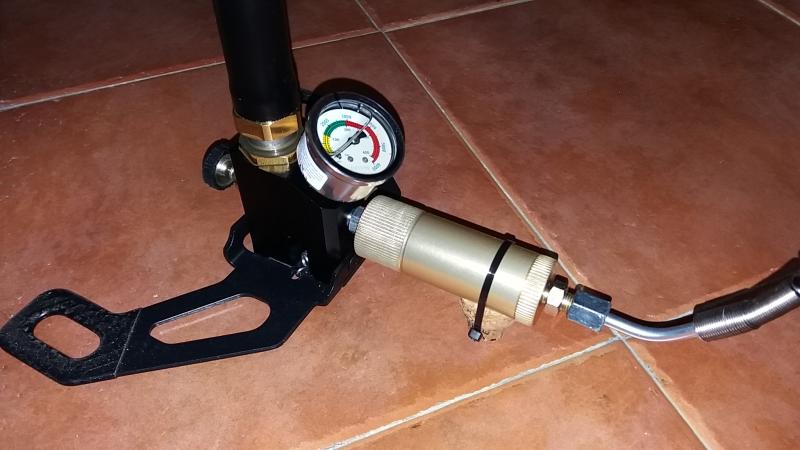 Pues al final resulto que la unica rosca que no era compatible es la que tiene la boquilla de carga. Me puse a probar y la rosca de la salida de la bomba y del su latiguillo si son las mismas asi que insertando juntas toricas he podido hacer el apaño y de momento no pierde aire al recargar y ha quedado como veis en las fotos. La unica ventaja es que me ahorro poner el latiguillo extra que compre. El corcho que hay debajo del filtro es yna pata de apoyo porque con el peso del mismo la bomba no se quedaba de pie.