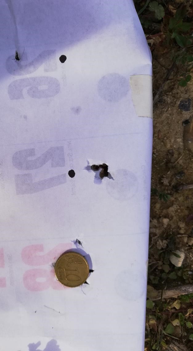 La madre que lo peinó, una cosa tan pequeña y diminuta y que te pueda volver loco. Espero que la putada que me pasó a mi como novato les sirva a otros de aprendizaje. Os pongo unas fotos de las agrupaciones que hice a 45 metros, 5 tiros en el punto y 10 disparos que lo tapa la moneda de 10 ctms., con el cargador y con monotiro que va de lujo, que me pasó la dirección un compañero del foro. Saludos.