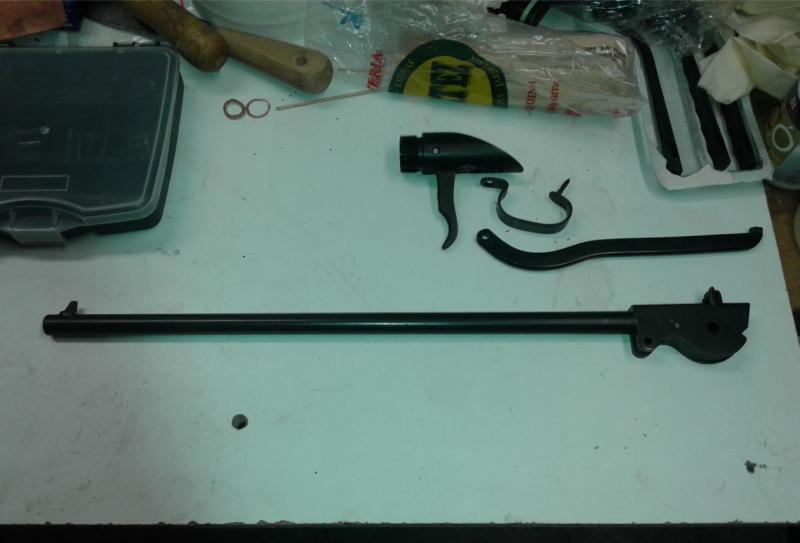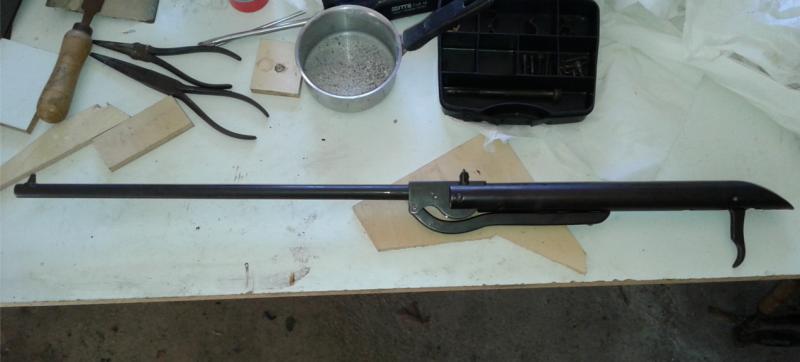 Bueno!!!! Pues... ya está terminada!!!. Al final he podido montar la acción con el "método del alemán"... esto es, sujetando el tapón trasero con el gatillo al banco de trabajo con un gato, y apoyando la cámara de aire en una tabla y ésta en la tripa, un poco de fuerza, y listo!!
