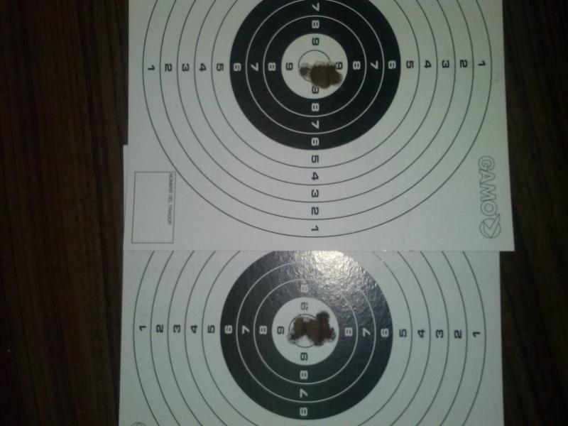 de todas formas , he probado y me ha dado 80 tiros como estos , 10 impactos en cada diana , jsb jumbo heavy a 36 metros de distancia con apoyo simple delantero, estoy alucinado con este juguete