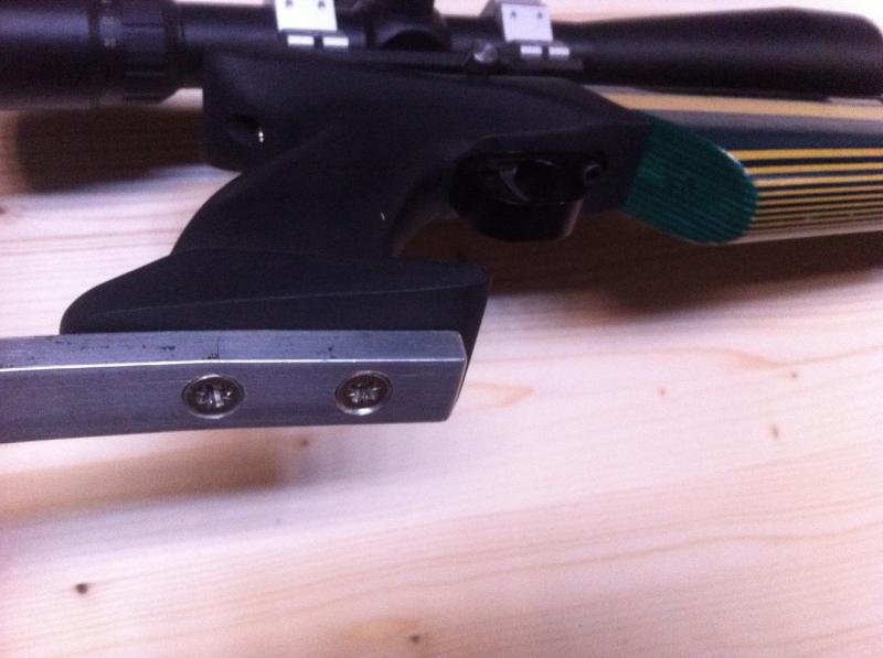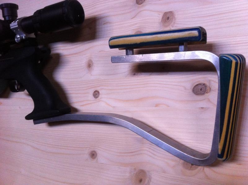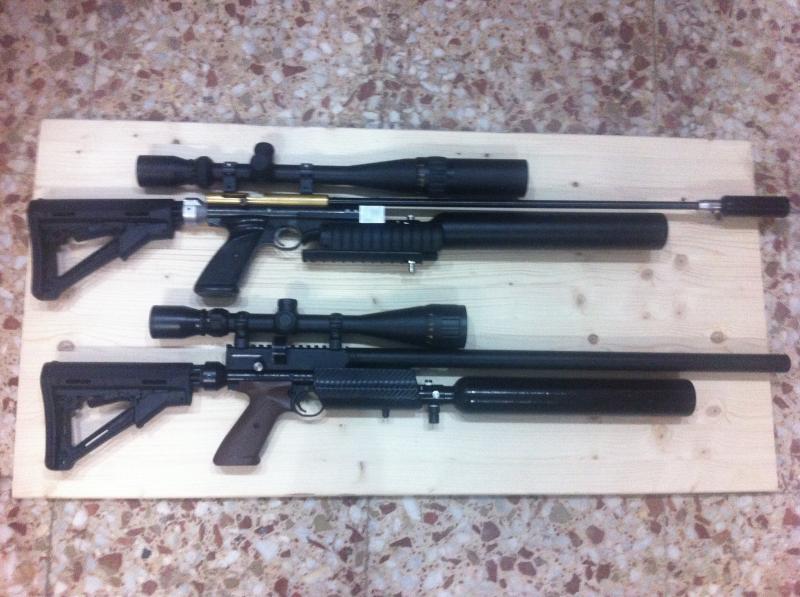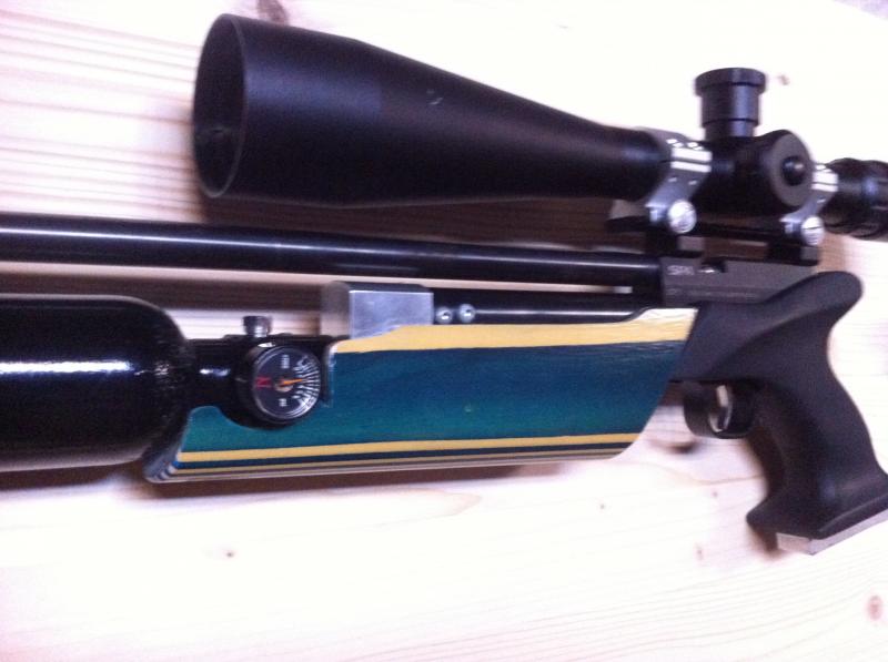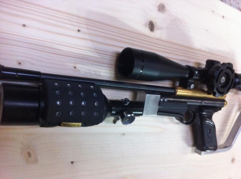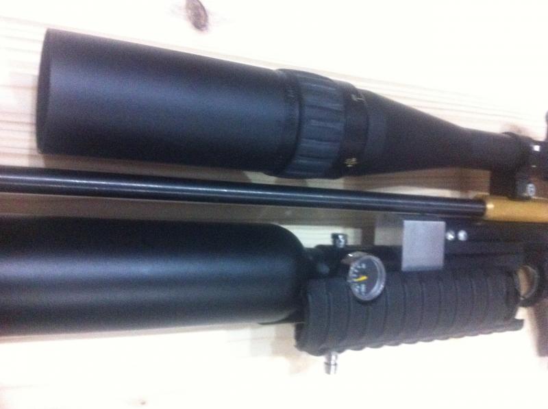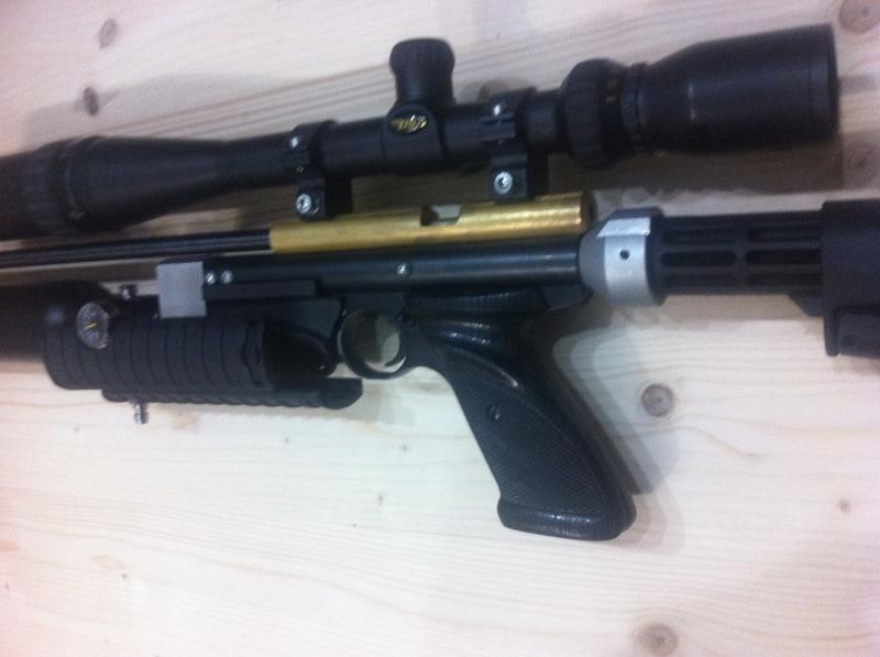 pues asi quedo la ultima crosman, cambie el deposito de 200 cc por uno de 400 cc , cambie el culatin squeleton de aluminio por una culata extensible tipo m4 con adaptador tipmman home made y asi ha quedado