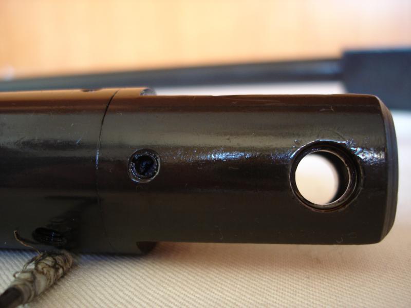 Cañón "tendido" para que escurra el aceite. Las alcayatas sirvieron de tapón, se enroyó teflón en la punta para tal menester y que no se pavonara el interior del cañón que estaba muy bién.