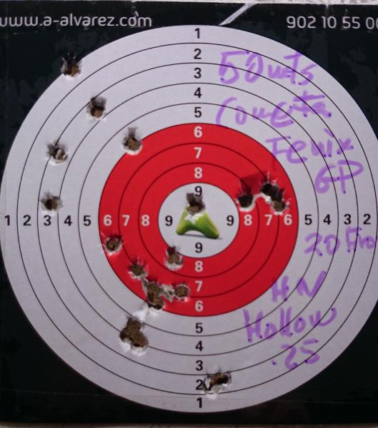 Después de esperar a hoy para tirar, vaya mierda de dia que he tenido: mucho viento, frio, tráfico, bloqueo del gatillo de la 4'5 por un pin del visor que se aflojó...una mierda. Con la 4'5mm no pude tirar más de 6 tiros y se acabó. Con la 6'35, con el viento racheado, hice lo que pude. Hace mucho que no tiro y se nota un montón, no sólo en el pulso si no también en la vista..joer parece que veo menos. El mejor resultado lo hice con los H&N hollow point, que con el gasram de 530 da unos 27J. El de fábrica, de 450Nw, da unos 21'5J. El visor un 9x50.