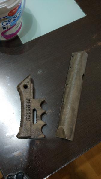 Buenas pues os dejo unas fotos de el grip , la rabera y carrillera de la impact impresos en 3D con filamento de madera, tintados y lacados .