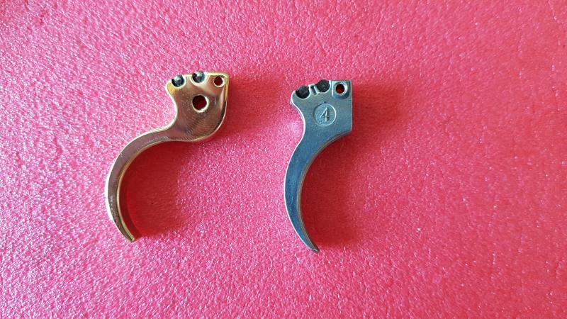 en estas fotos se puede ver la carabina con el disparador original en plateado vs el disparador de rowan engineering en dorado y la posición de mi mano al accionar el disparador original