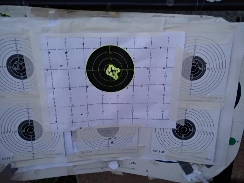 Por cierto, la carabina va de fábula y eso que no soy experto y seguro que no le saco el potencial máximo que tiene. Adjunto algunas dianas a 40 y 50 metros con viento mínimo y JSB Heavy.