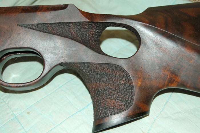 En culatas comerciales, tanto el acabado rugoso, o punteado, como el picado en diamante, se hace en segundos con un molde y una prensa hidráulica que graba el dibujo en la madera. Grabados como los que traen las carabinas Air Arms, se hacen por la técnica de grabado al laser.