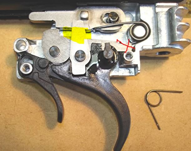Se trata de que el muelle no se apoye en la leva inferior pero si den de hacer fuerza con el trinquete superior par que amartille. La leva con un poco de compresión de la goma es suficiente para que esté en contacto la cola con el gatillo