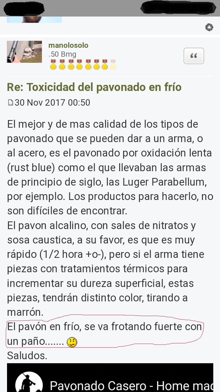 A mí, particularmente, no me gusta el pavonado en frío, y mas, sabiendo hacer el alcalino, pero no le des dos manos, dale 10 o 15, y luego me cuentas, y desde luego, mucho mejor que el arcaico, rudimentario y engorroso método del soplete...... que ese no se va frotando fuerte con un trapo, que va!!!!!, vamos, que ni siquiera es un pavonado........