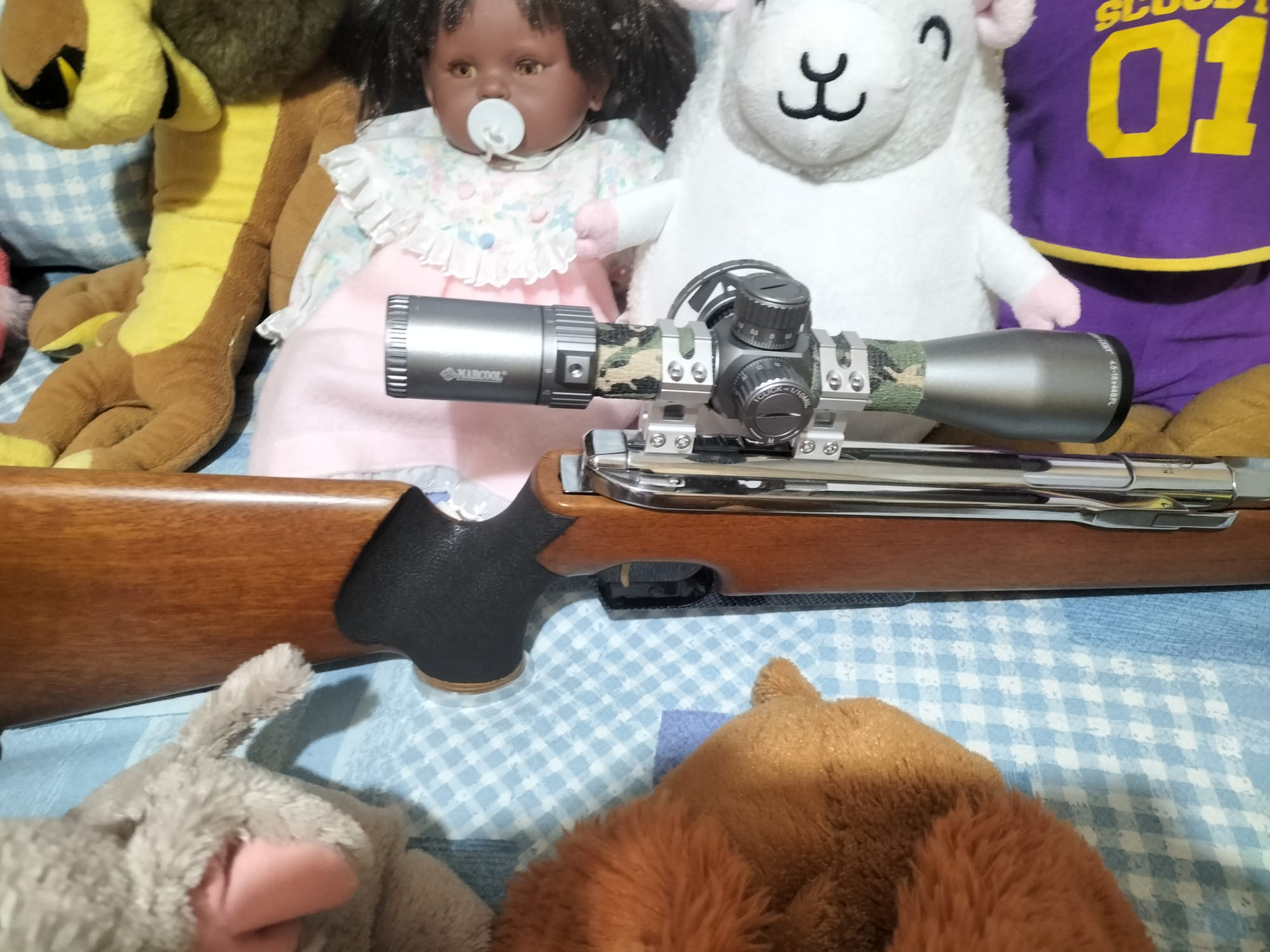 Y hay no se puede apreciar bien ,por qué la culata está perfecta,el gatillo se le coloco uno de latón y el guardamonte es de fibra de carbono,un lujazo total y encima es una carabina espectacular,un capricho total, jajajaja.