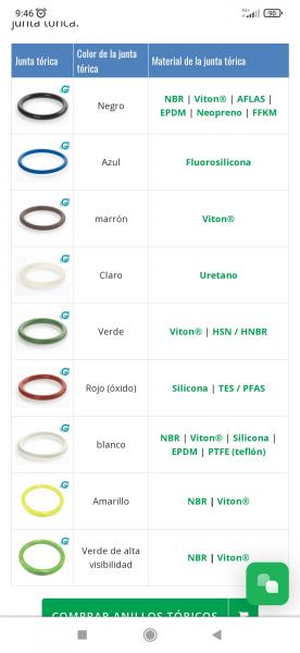 El color de las juntas tóricas sirve para identificar de que compuesto ó material están fabricadas. Algunas juntas pueden ser sel mismo material con distinto color.