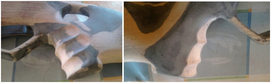 - Hice y pegué dos pequeños taquitos de madera a medida para tapar los huecos donde iba encajado el anterior guardamonte, puesto que este nuevo que le iba a hacer, irÃa integrado directamente a la pieza entera y no necesitarÃa tornillos.