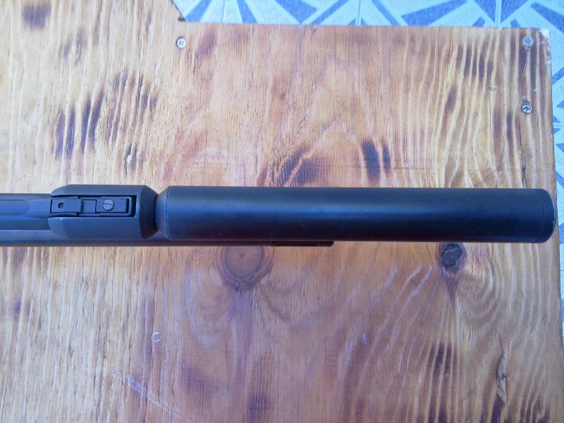 Yo terminé por amputar completamente el punto de mira, ya que tirar con miras abiertas igualmente és una mierda en en ésta arma. Y de paso aproveché para cortar el último tramo de plástico del cañón y la parte final del cañón que no viene estriado y le hice corona.