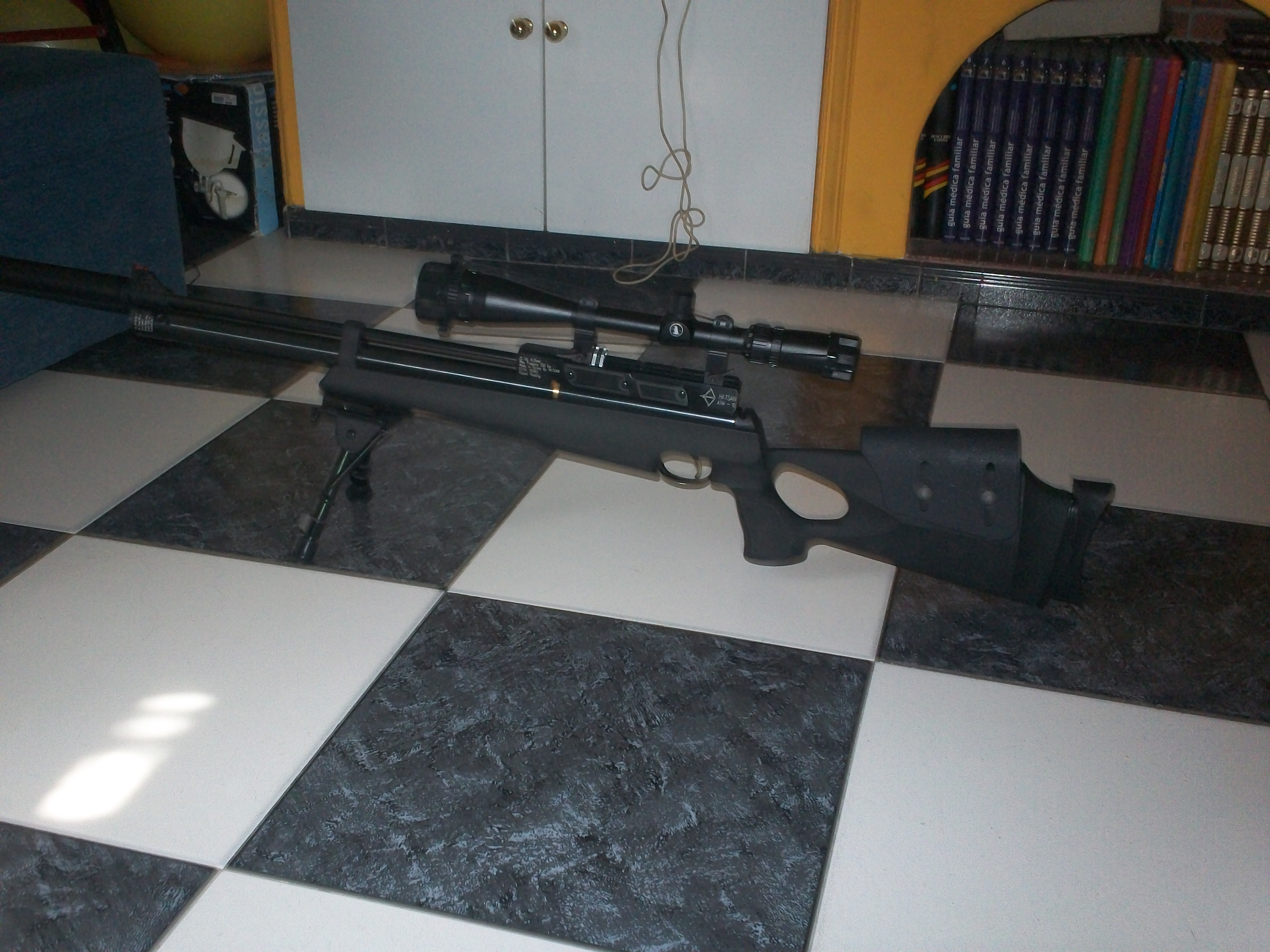 bueno pues aqui esta la hatsan con la carrillera y demas accesorios ya solo me falta el regulador que estoy esperando y el chrony para hacerle las pruebas