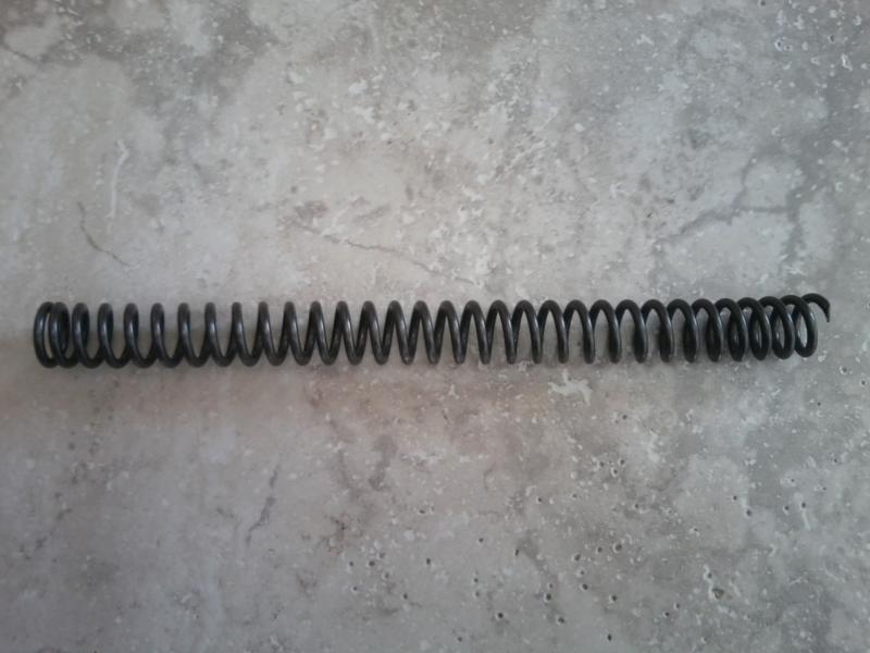 Una foto del muelle que tenia montado, donde se aprecia el extremo cortado. Tiene 30 vueltas (+/-), 14mm de interior (exactamente 13,85mm), alambre de 3mm, y una longitud de 235mm.