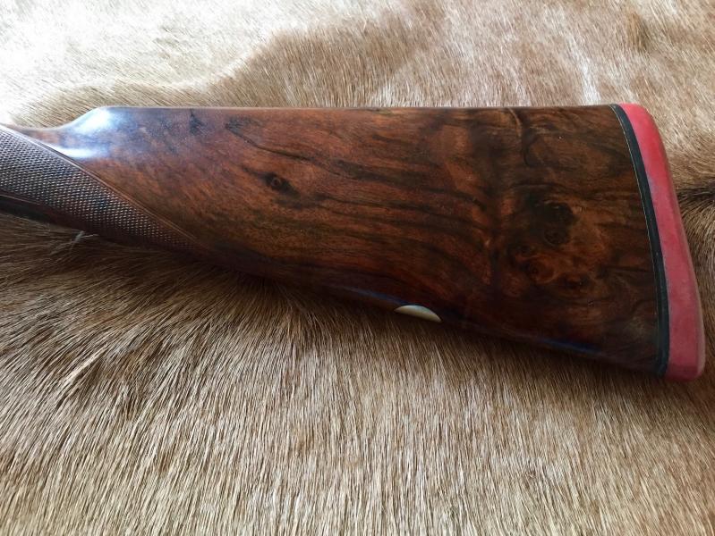 La culata es inglesa de nogal seleccionado y tiene una medida total de 37,5 cms desde el primer gatillo incluyendo la cantonera (de color rojo o "tipo Holland" como se suele llamar).
