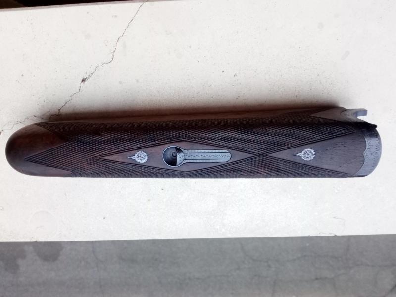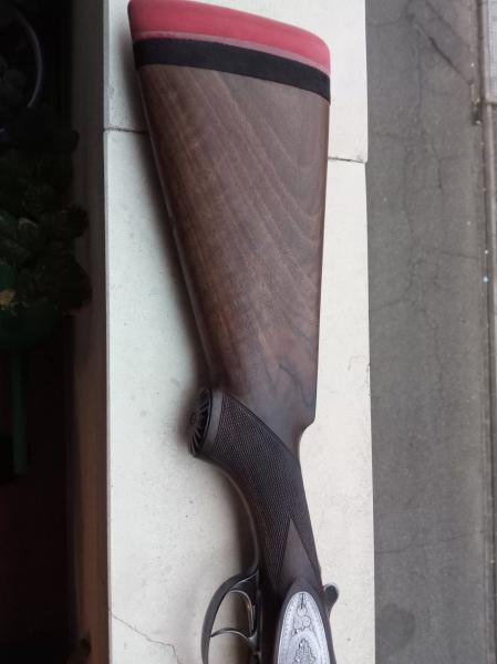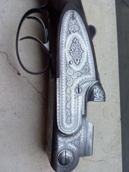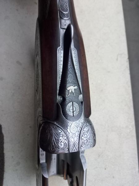 Escopeta de alta gama, con pletinas largas auténticas y grabados a mano. Serie especial Paloma de plata. Cañones de alta calidad realizado en aceros boehler antinit. Maderas de nogal. Choques de 3 estrellas abiertas y 2 estrellas. Doble gatillo, el primero articulado. Peso de 3250 gramos.
