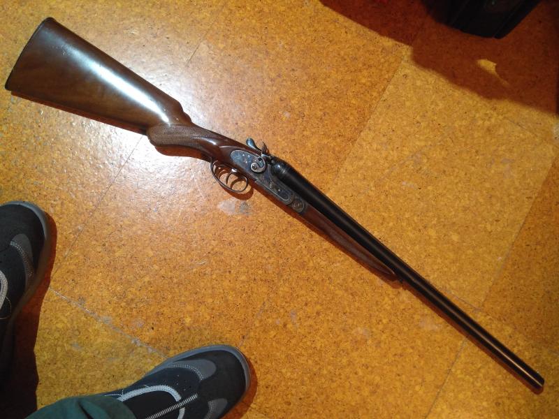 Vendo escopeta paralela marca M.A. (Martin Amuategui), de perrillos, calibre 12/70, ambos cañones de 3 estrellas, 49cm de cañon y 90 de arma, cuando la compre pensaba que estaba recortada, por alguien muy profesional ya que esta muy bien hecho, pero ahora mirandola un restaurador de la zona me indica que podria ser asi de origen ya que cuando se recortan se tachan los cuños viejos y se marcan los nuevos, y esta no tiene cuños tachados.
