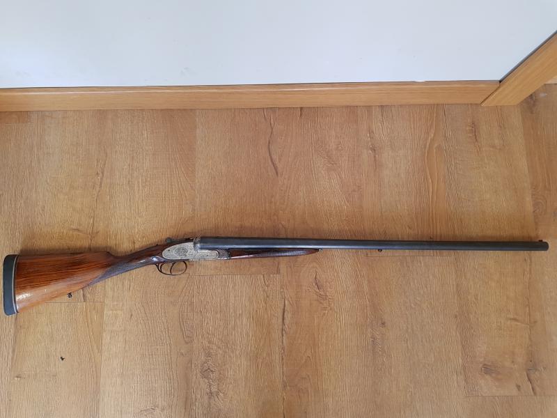 Escopeta de dos tiros, fuego central, cañones de acero especial con baño interior de cromo duro, extractores de doble radio, triple enganche incrustado en la báscula, sin pasador transversal. Llaves finas de doble seguro encajadas en la báscula, con culata incrustada en aquella para evitar el resalte de la misma. Percutores ocultos y movimiento automático, doble seguro, delantera fina, grabado fino, caja inglesa, pistolet o pistola entera de nogal superior finamente cuadrillada.