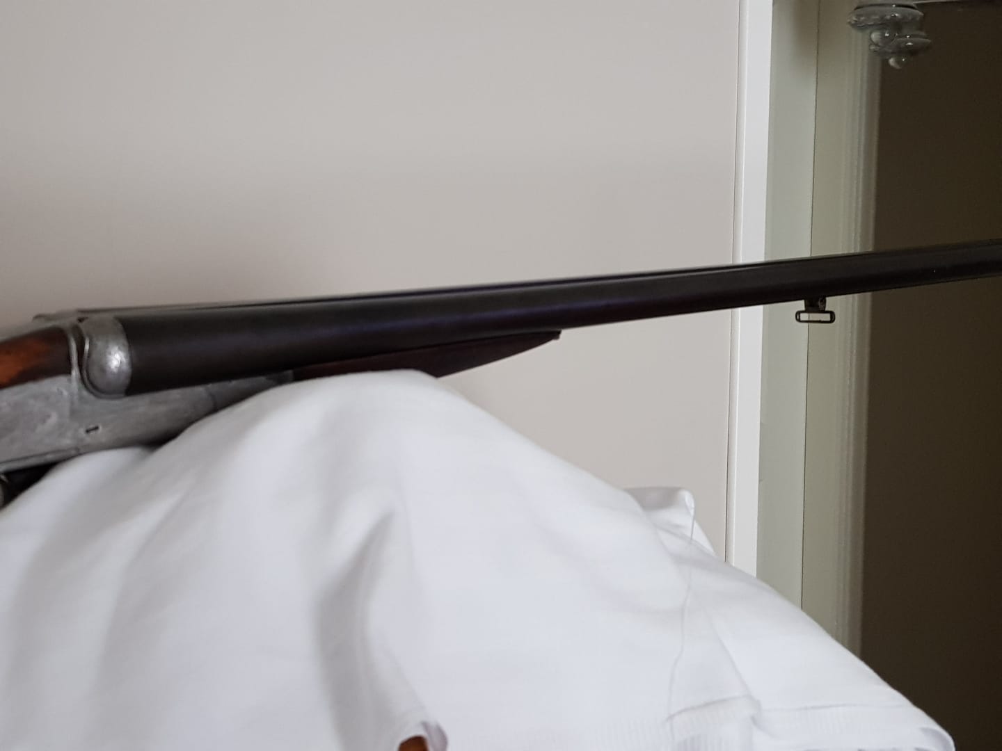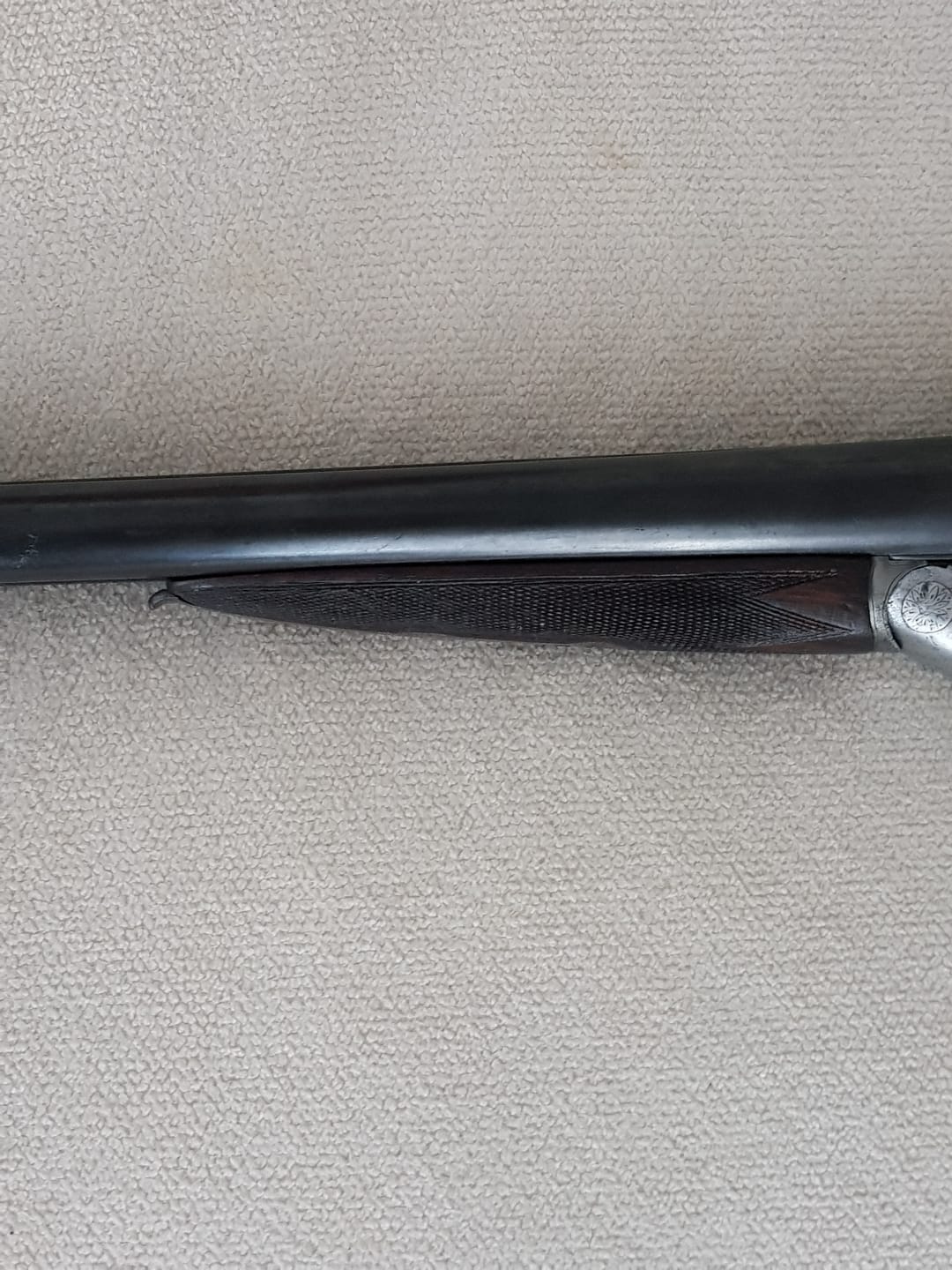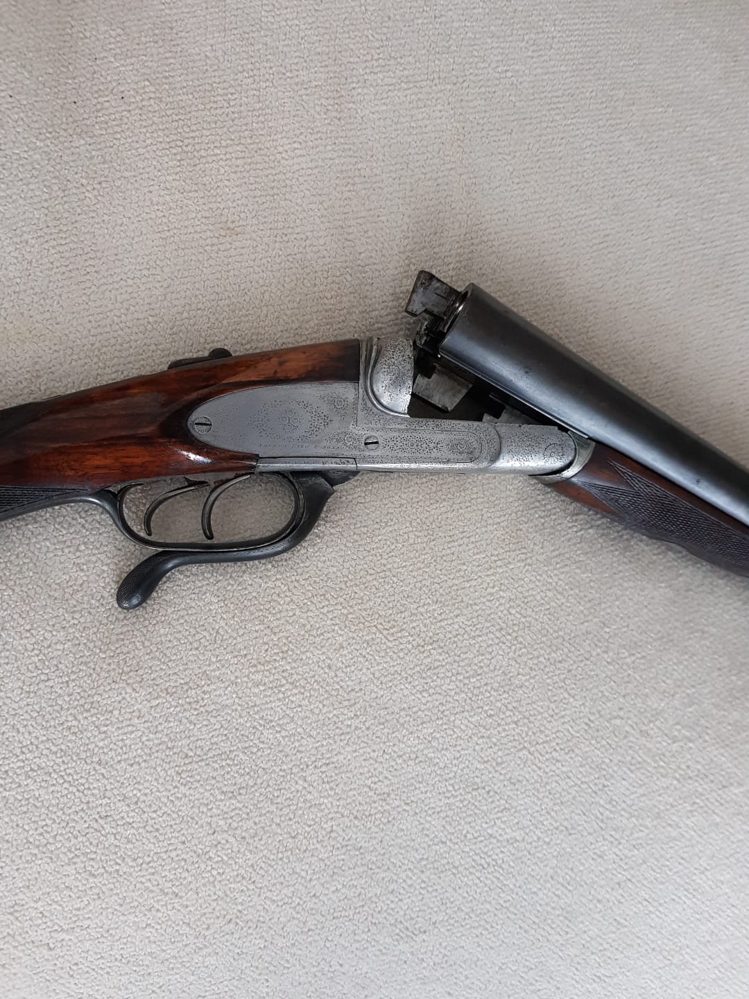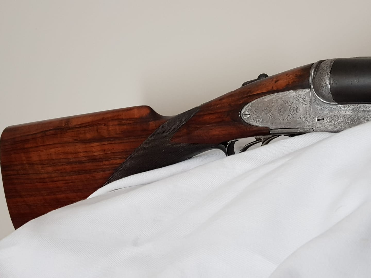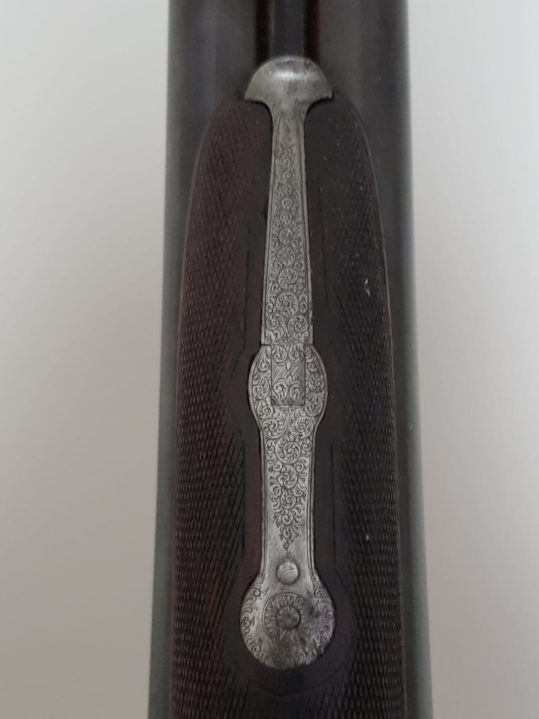 Exclusiva escopeta inglesa de la prestigiosa casa Joseph Lang. Es el modelo "underlever". Año de fabricación 1912. Madera alto grado, culata 35 cm sin cantonera. Finos grabados. Buen estado. Ajustada y encare divino.