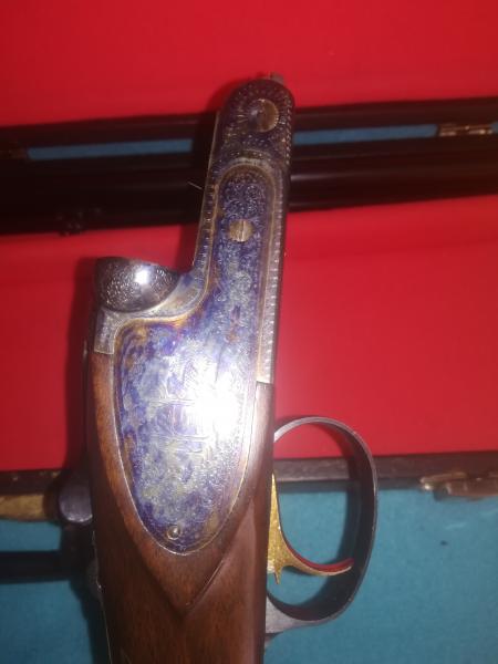 Escopeta paralela, pletinas jaspe enteras, bonitos grabados, choques en ambos cañones, disparador único selector de tiro, culata pistolet, solo ha tirado media caja de cartuchos, la otra media se regalan. Precio 480€.677cuarenta y seis397uno.
