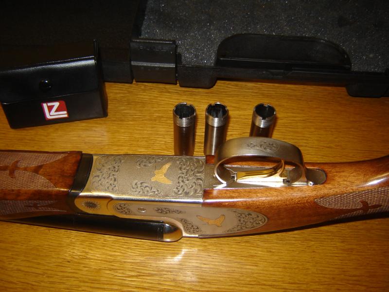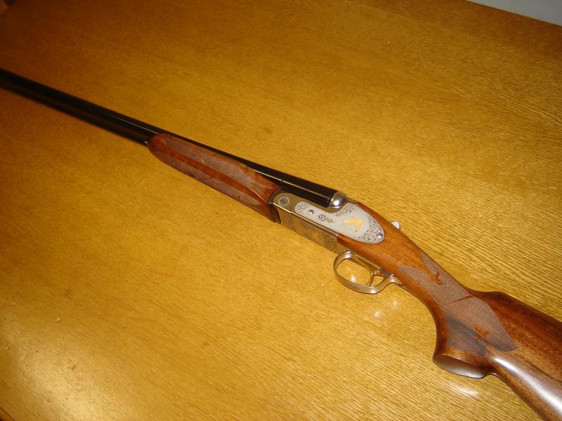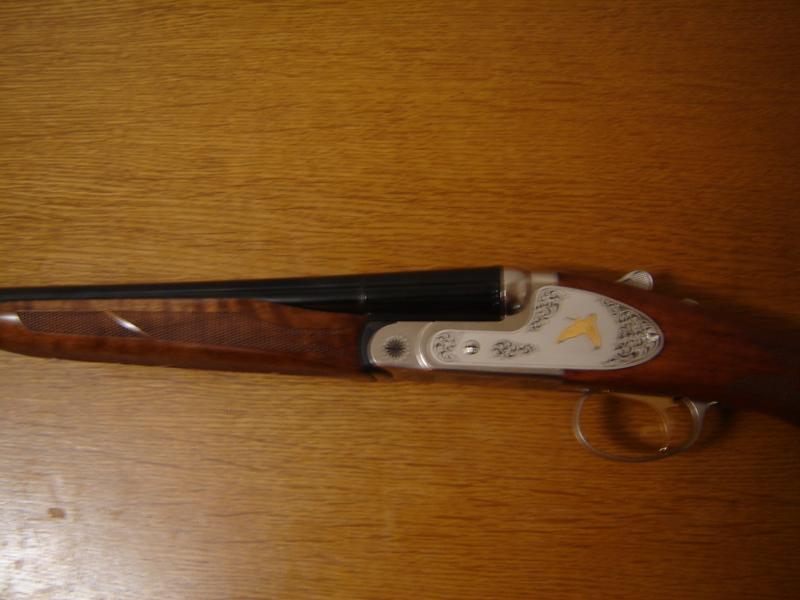 Con grabados de becadas en dorado en ambas pletinas, y punto de mira de fibra óptica.