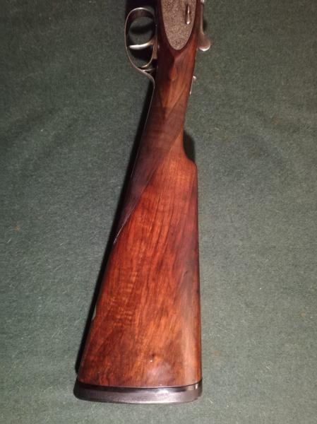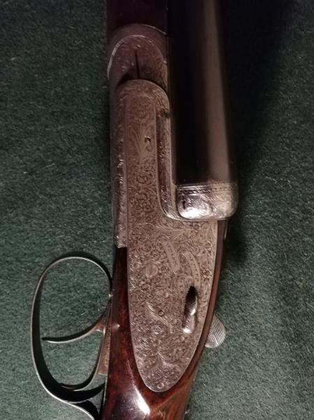 Vendo Grulla-Unión Armera del año 1945 letra Ñ modelo 215 del calibre 12/70 ánima 18.5, longitud 71cm de cañón, 7 y 8 décimas, filete de refuerzo en la báscula, labio en el guardamonte, doble gatillo articulado, válvula de escape de gases, culata inglesa, madera de nogal escogido, expulsores automáticos triple cierre purdey, pletinas desmontables a mano, mecanismo bañado en oro, acero bruñido exquisitamente grabada