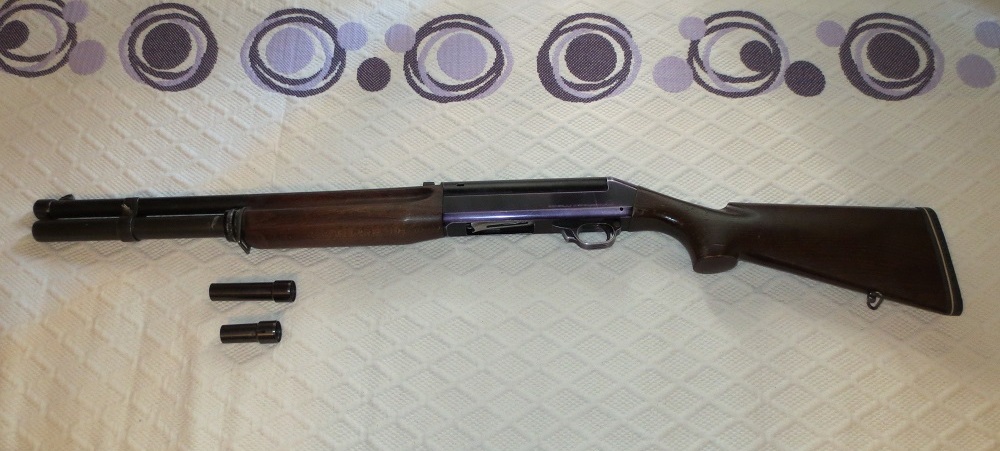 La escopeta es del calibre 12, tiene el cañón cilíndrico de 47 cm., con rosca exterior para choques, está provista de alza y punto de mira, el depósito está previsto para 7 cartuchos + 1 en la recámara, se entrega con limitadores de 2 + 1 y de 4 + 1, y se vende con cubrerosca y dos choques exteriores que vienen numerados con el 1 y 5.