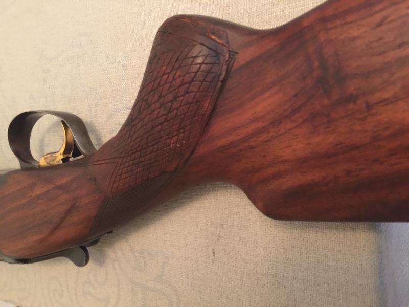 Una aclaración para que lo sepa la gente, lo que se vé en la empuñadura (parte derecha)no es una grieta de la madera, es masilla suplementaria color marrón que se la puso el Anterior dueño porque tenía la mano grande, es de color marrón y le hizo casi el mismo dibujo que la empuñadura. Se puede quitar a gusto del consumidor, yo no la quité porque me quedaba bien ya que tengo la mano grande. El estado de funcionamiento de la escopeta es perfecto, esas escopetas están garantizadas de por vida por la fabrica Browning.