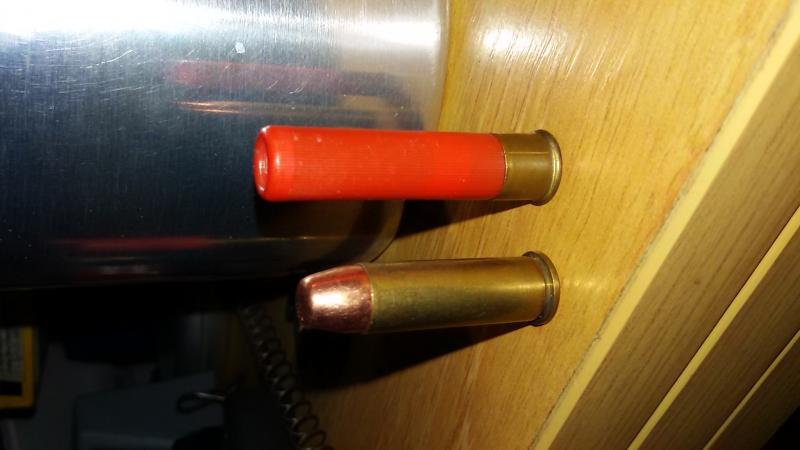 Tal y como comenta el compañero lewis, son cartuchos de caza de 9mm de diámetro, una bala del 38spl entra físicamente en la recamara, seguramente una del 357mag también, pero es una escopeta preparada para perdigones y presiones de cartucho, no tengo ninguna intención de arriesgarme a comprobar si aguanta una bala del 38spl.