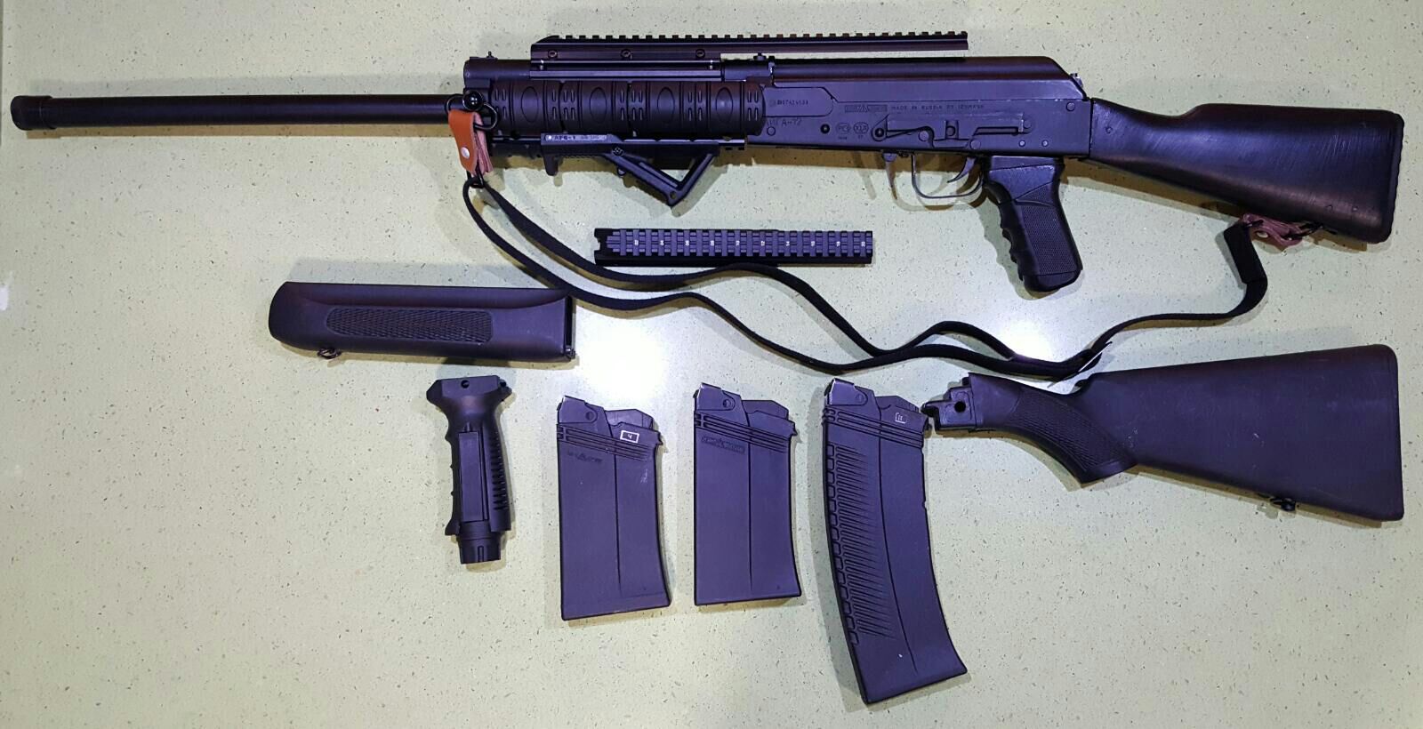lleva su correa original de AK en negro con safaje rápido en la cogida del raíl, también tiene un puño y otro de apuntado rápido montado en el raíl táctico.