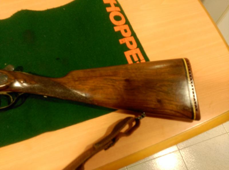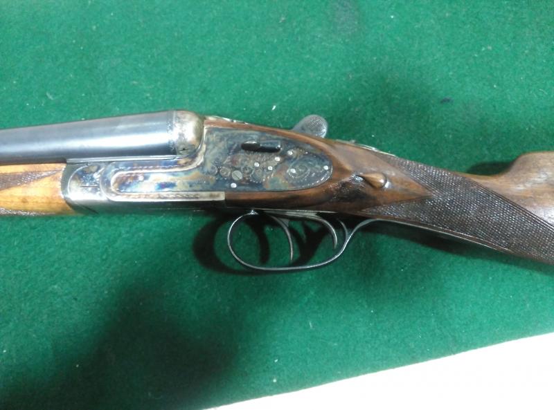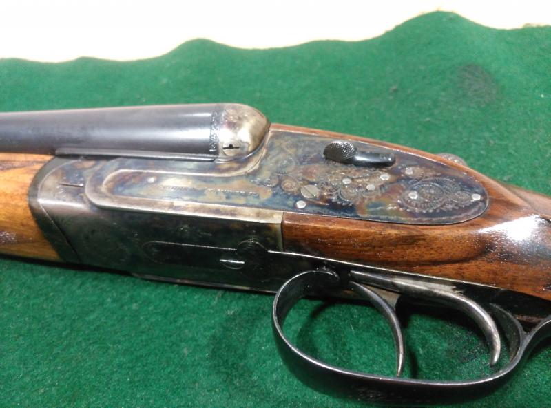 Paralela cal 12 de caja completa, cañones de 71 con * y ***. Expulsora, válvulas de gases, lágrimas, pletinas desmontables (grabadas y jaspeadas). Sin uso y como nueva. Lo único que se le ha hecho ha sido levantar el barniz de fábrica y hacer maderas al aceite. 900