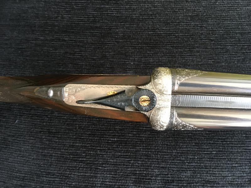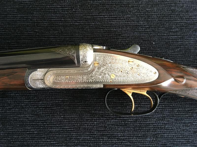Se vende escopeta paralela del calibre 16 marca Muguruza; la escopeta fue restaurada hace años, equipándose con maderas de mayor grado que las originales. Desde entonces se encuentra expuesta en una vitrina sin utilizarse. Tiene lágrimas y dorados, es expulsora y tiene chokes de 3* * * y 1*. El maletín de las fotos no va incluido (porque ya no lo tengo), se entrega en el maletín de aluminio de la imagen. En la culata tiene una placa con las iniciales AB. Muy buen estado.