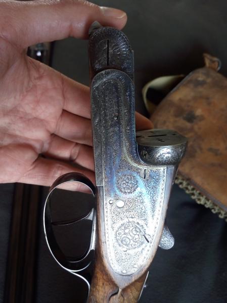 Cañones demiblok de acero boehler antinit en impecable estado, con choques de 4 y 3 estrellas. Triple cierre. Pletinas largas con finos grabados tipo purdey. Doble gatillo, con el primero articulado. Culata de madera de nogal, de tipo inglesa, con lágrima.