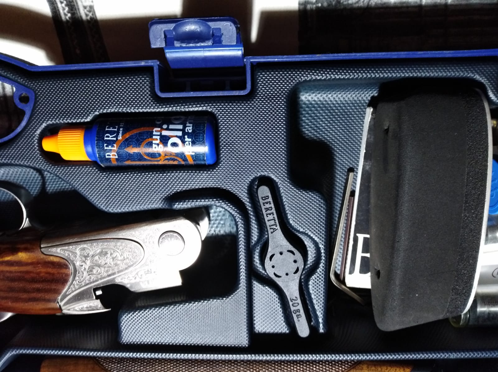 va con su estuche rigido de beretta, un bote de aceite y una llave allen para quitar o mover la carrillera