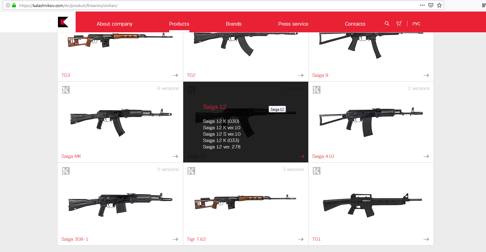 Por cierto aqui te dejo un pantallazo de la pagina de Kalashnikov PARA QUE VEAS EN PERSONA LOS MODELOS DE LA SAIGA 12 QUE SE VENDEN A DIA DE HOY.Puesto que los de wikipedia alguno ya no esta a la venta a dia de hoy pero lo estuvieron.