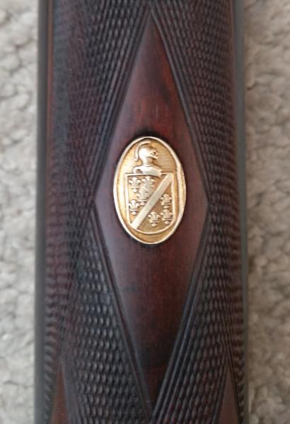 Espectaculares maderas seleccionadas que han sido restauradas y terminadas al aceite de raíz roja. La culata se encuentra original sin cortar. Con escudo dorado de familia Arrizabalaga en el guardamanos.