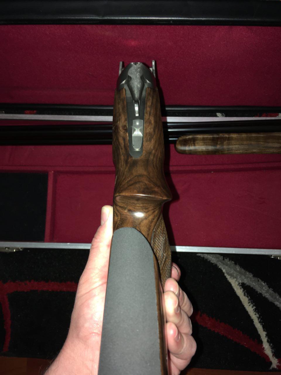 Posee maderas de nogal turco de grado 5 hechas a medida con engarce para el pulgar y segrinado. La culata tiene una longitud desde el gatillo hasta la cantonera de 36cm y,como se puede ver en las fotos, tiene algo de ventaja hacia la izquierda corregible si se desea gracias al lomo, el cual posee regulación en altura y deriva idéntica a la Perazzi y goma en la mitad delantera de la parte superior. Es una culata para diestros con la que el plato izquierdo apenas hay que adelantarlo, y al derecho hay que darle el adelanto de una culata normal. Disparadores afinados en Armería El Reno a 500 gramos de presión, de tal forma que es imposible quedarse engatillado. Se puede elegir entre maletín de terciopelo rojo y negro o maletín de aluminio tipo Browning con 3 cerraduras, en ambos casos con fundas de tela para guardar el arma. Caja de accesorios plástica, hermética y de seguridad.