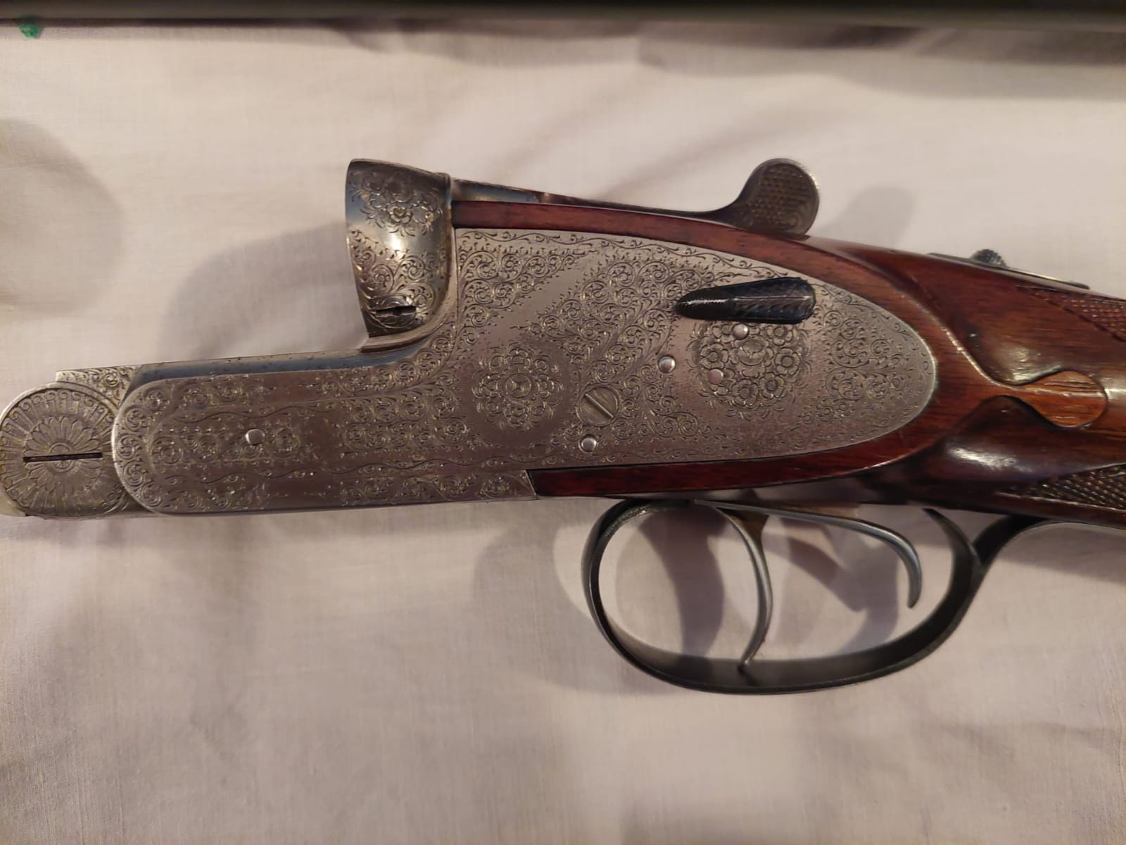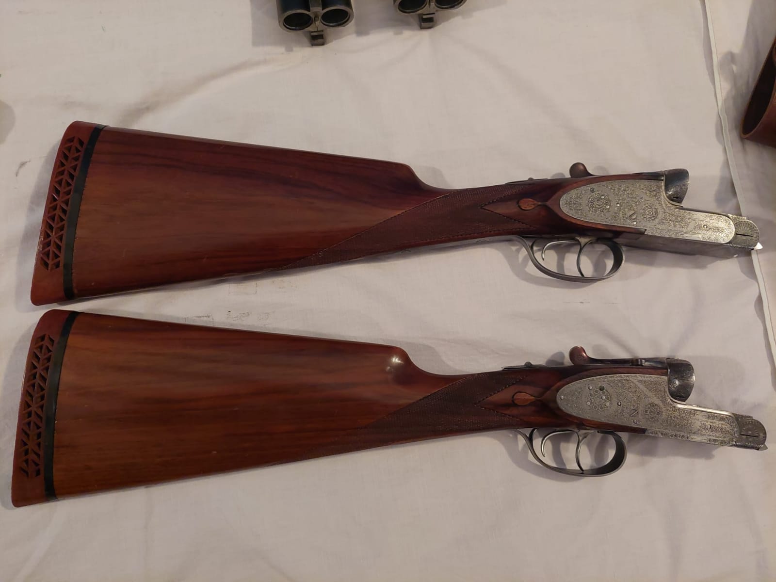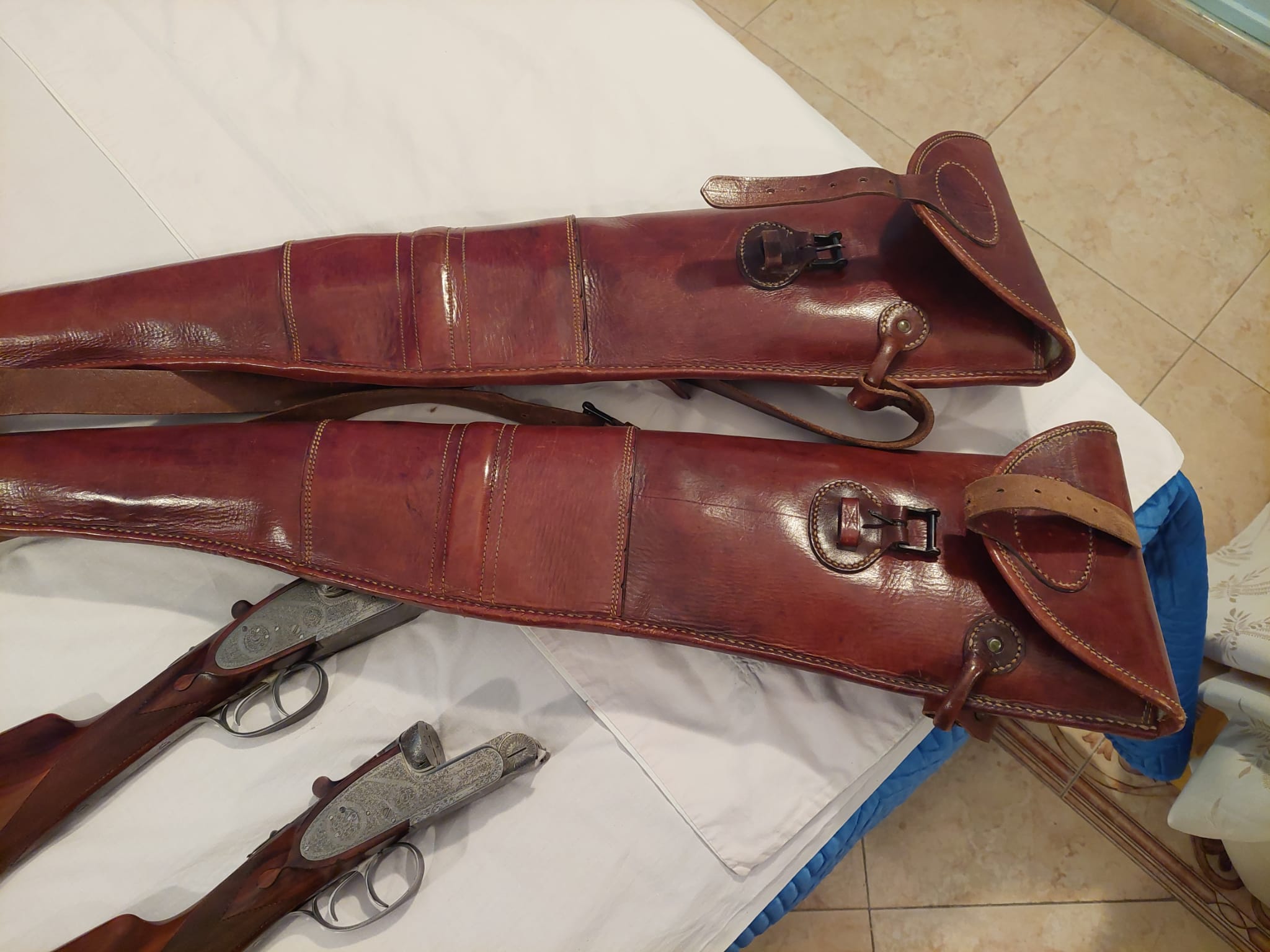 Vendo pareja de escopetas paralelas marca "IRU" de Antonio Madariaga, cañones de 70ctm. con 3 y 1 estrellas, expulsoras, gatillo articulado, triple cierre Purdey, seguro automático, válvula de escape de gases, pletinas desmontables con palomilla, finos grabados, inserciones en oro, números correlativos, culatas de nogal, fundas de cuero forradas de borreguillo.