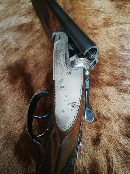 Escopeta Grulla (unión armera) modelo 208D calibre 16/70 extractora. Muy ligera y con un encare excelente. Coscorros grabados y escape de gases. Maderas de nogal fino.