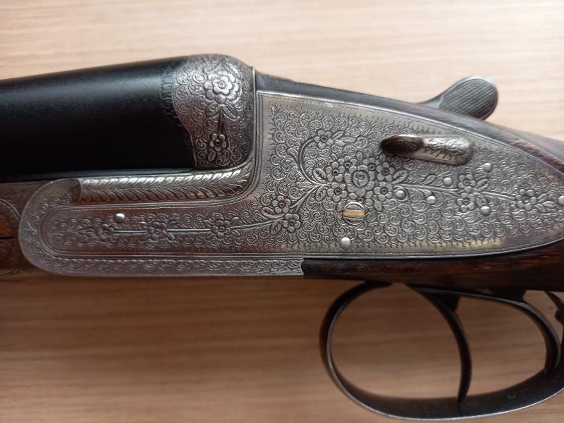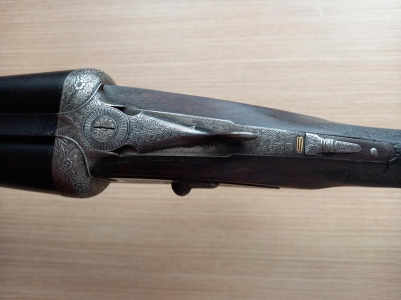 Preciosos grabados hechos a mano, orejetas de refuerzo y llaves en oro, cañones pavonados en pavón rugoso para la intemperie.
