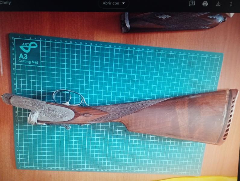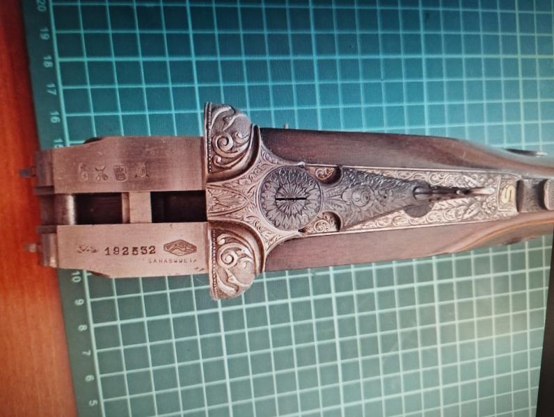 Es una paralela Víctor Sarasqueta calibre 12 modelo 208 del año.1969, bien de Pavón e interior de cañones a espejo, con choques 17,4 y 17,9 (1 estrella y 3 estrellas).