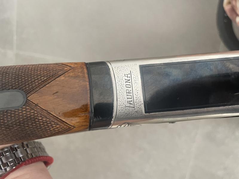 Vendo escopeta superpuesta Laurona cal. 12, en el lateral del cañón, debajo de la caña indica ** y **** y 71 cm., expulsores, cromo negro.