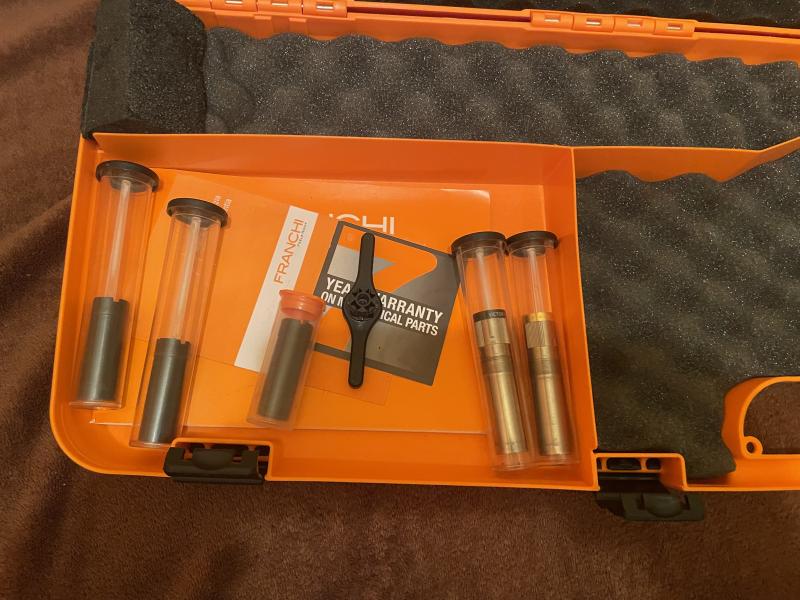 Franchi Feeleng acero (no ergal), cal 20/76, cañones 68 , con su maletín y los tres chokes de fábrica. Pocos tiros, estado muy bueno solo tiene un mínimo bollito en la solista y alguna marca ligera de uso (poco apreciables) como veréis en las fotos.