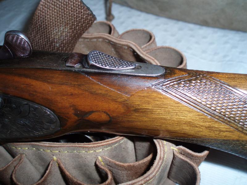 El peso del arma es de 3353 gramos. La culata es de tipo príncipe de Gales. La madera de la que está hecha, sin ser sublime no está nada mal, y quedaría muy bien si quien se la quedase la dejara al aceite (como sugerencia). Es lo que yo quería hacer y no he podido por falta de tiempo... La compré con intención de pasarme a las paralelas, pero no me consigo adaptar por más que lo he intentado con varias, y eso me ha desincentivado.