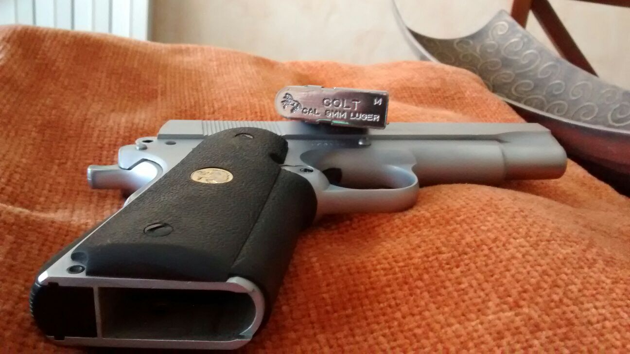 El colt va con un cargador, tiene creo 4" y su anterior dueño la tenia para defensa así que casi ni se usó y yo desde que la tengo 15 cartuchos de prueba. Es mas fina que una 9mm convencional puesto que lleva cargador lineal, es compatible en piezas con cualquier 1911 del mercado, y se puede probar en Navarra.